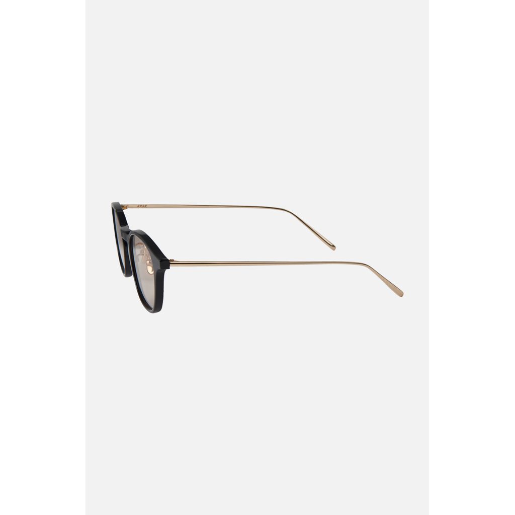 ジェンダーレスなモデルとして徹底的にサイズ感にこだわったボスリントンシルエットのコンビネーションタイプ。 エッジの効いた直線的なラインのキーホールブリッジが全体的に柔和なフロントに引き締まったアクセントを添え。 レトロな仕様ながらもどこかシャープで都会的な印象を与えてくれる。アセテート素材でのカジュアルなリム部分と対比的な高級感あるメタル素材の極細テンプルのバランス感、ブラウンベースのフレームカラーも汎用性抜群となっている。
