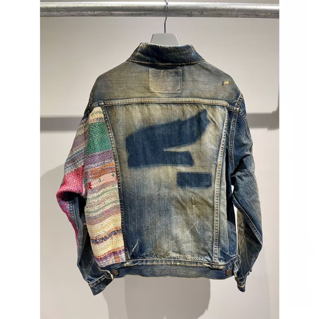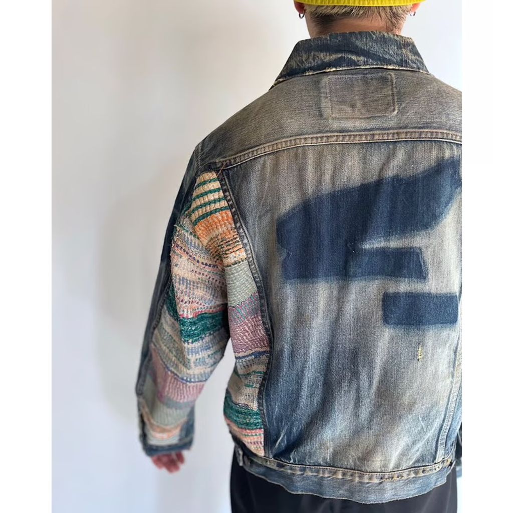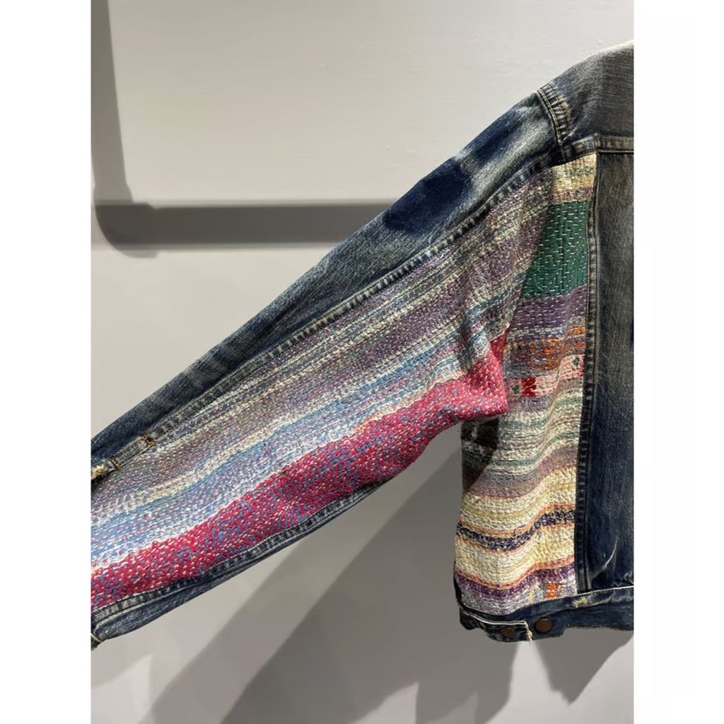 デッドストックのデニムジャケットにヴィンテージのラリーキルトで切り替えたアイテム