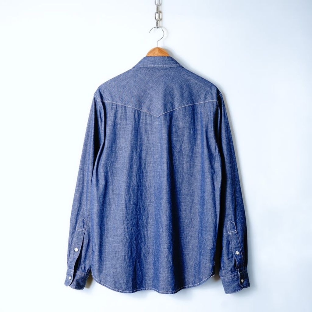 タテヨコムラ糸を使い織り上げた中肉のセルビッチ素材を使用し製作したウエスタンシャツ。ムラ糸の風合いと旧力織機にてゆっくりと織り上げる事によりヴィンテージ感ある風合いになり、ソフトな着心地で通年着用できる シャツとして重宝します。