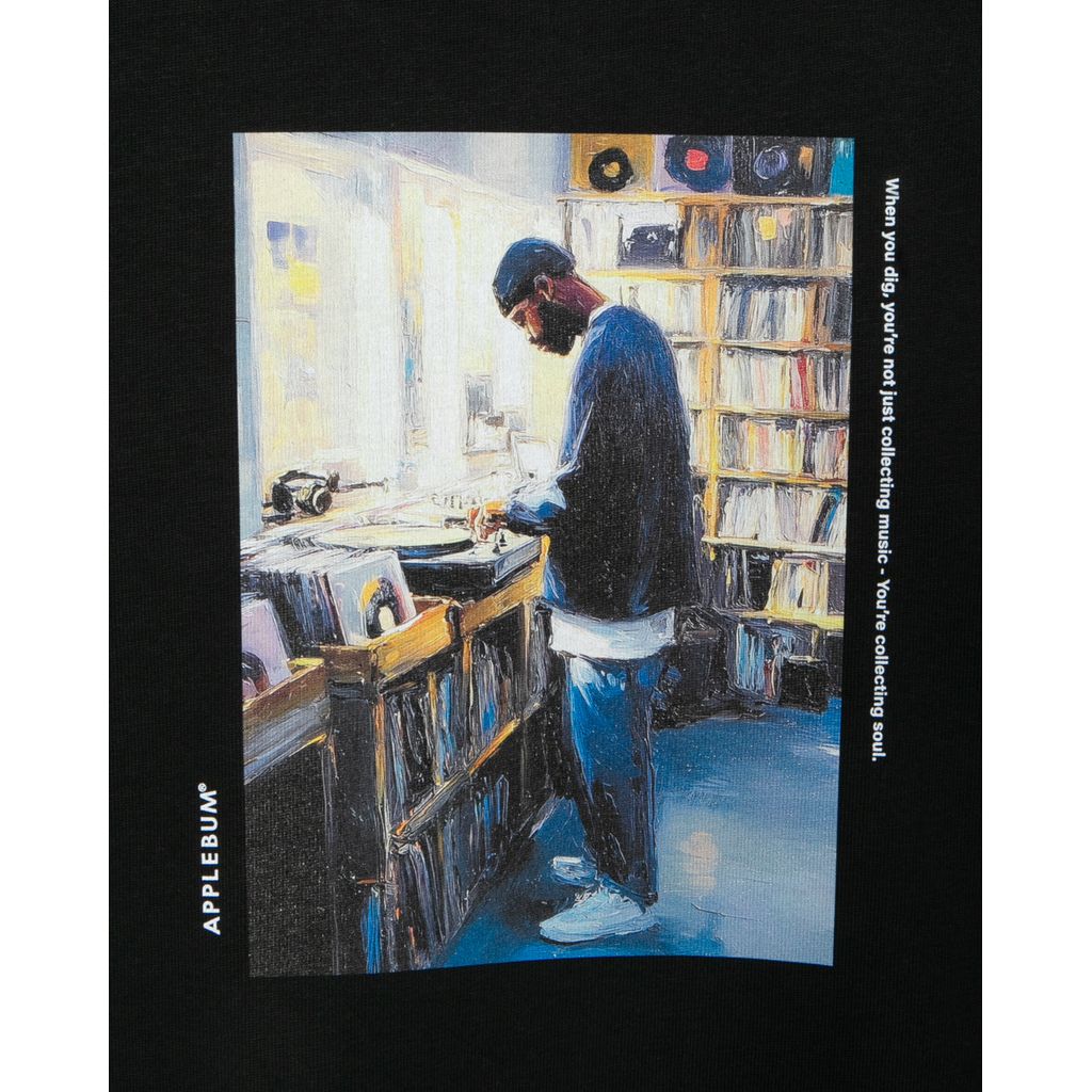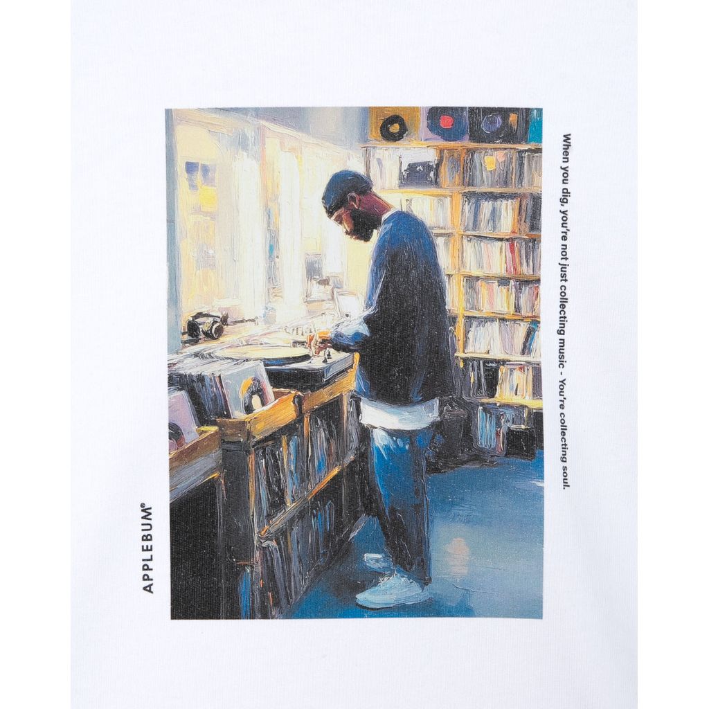 レコードショップでディグに没頭する姿を、油絵のようなタッチで描いたグラフィックTシャツ。