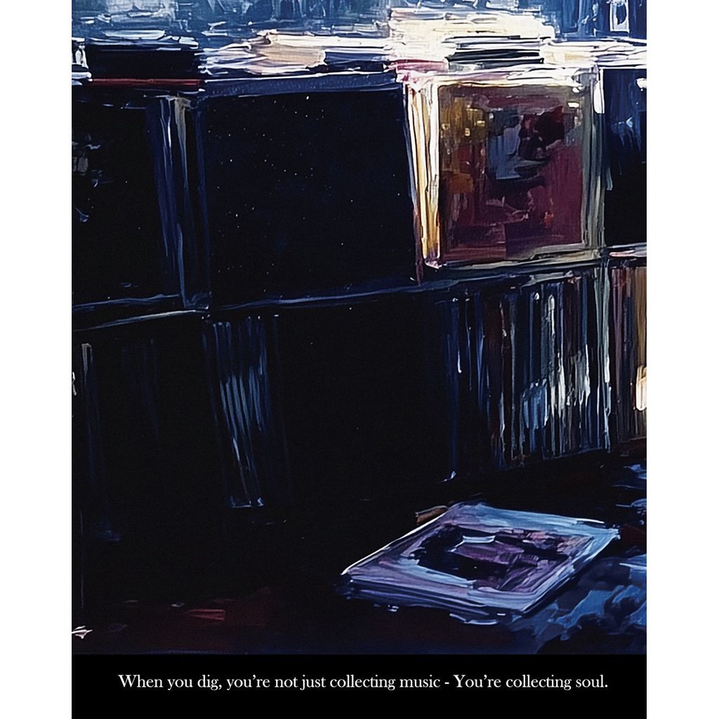 ポスター下部には、「When you dig, you're not just collecting music. You're collecting soul.」 (ディグするとき、君が集めているのは音楽じゃない。魂だ。)のメッセージ。