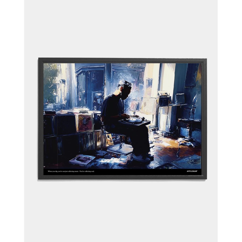 レコードに針を落とす瞬間を捉え、“Diggin’ in the Crates”カルチャーの本質をアートタッチで表現したグラフィックのA1ポスター。