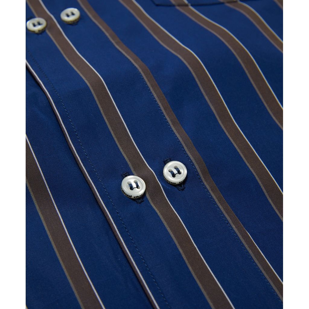 ダブルボタンアップのフロントのストライプシャツ。パッチポケットカーブドヘム。