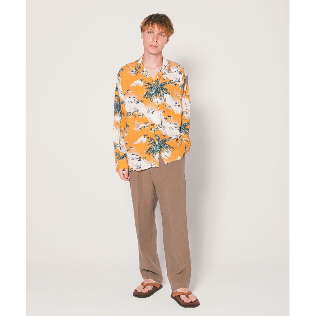 定番のワイドシルエットパンツをアップデート。今季は適度なシャリ感が特徴のさっぱり涼しげな程よい厚みのあるリネン素材を採用。フロントにタックを2本ずつ入れてゆとりを持たせ、裾にかけて若干テーパードかけることで独特なシルエットを演出。腰回りのボリュームを少しカットしてすっきりとした印象に仕上げた。両脇にファスナー付きのスラッシュポケットを配置。