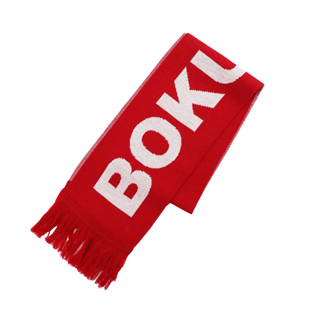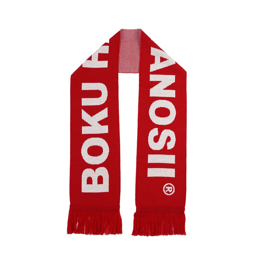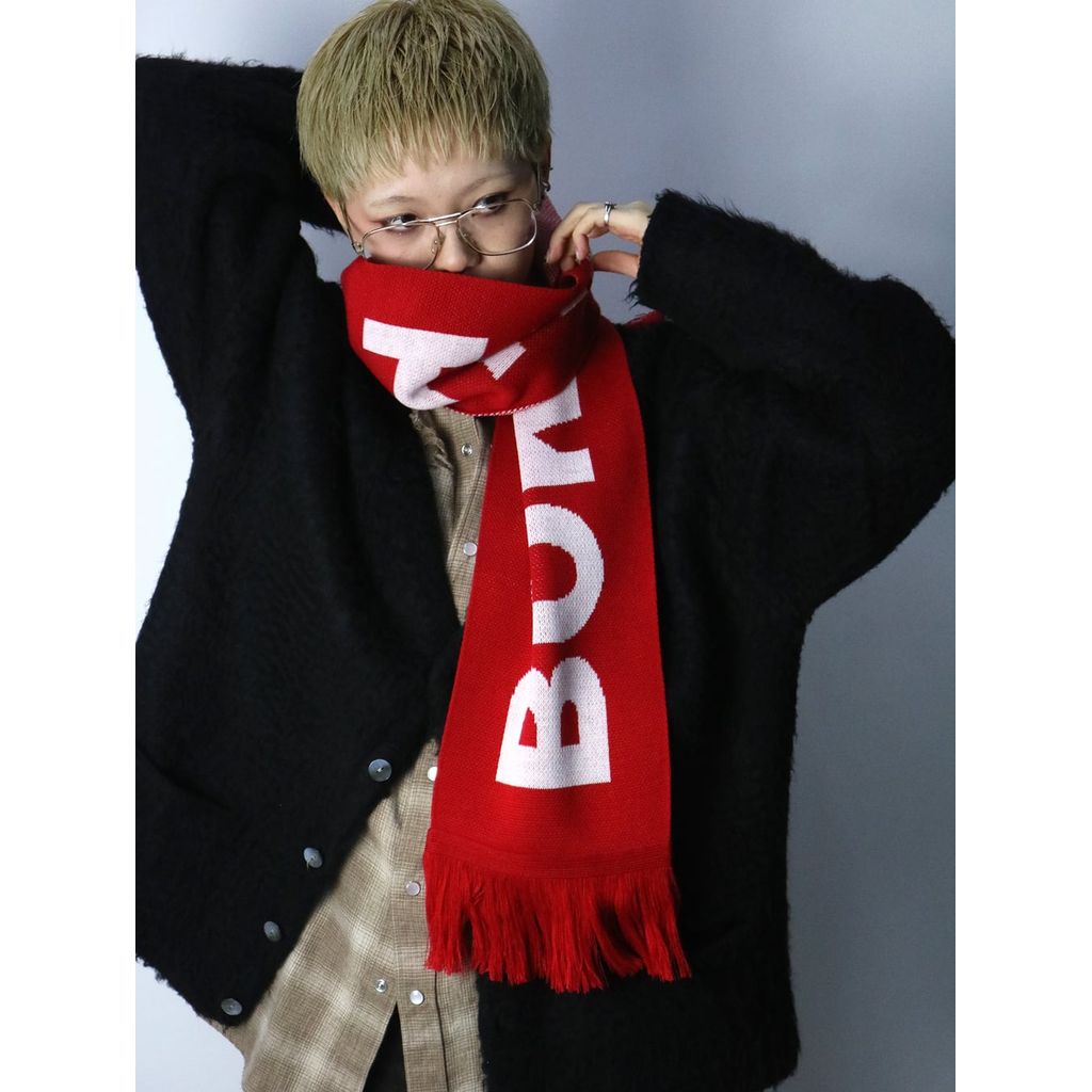 BOKU HA TANOSII のブランドロゴを大胆に配したフリンジ付きマフラー。