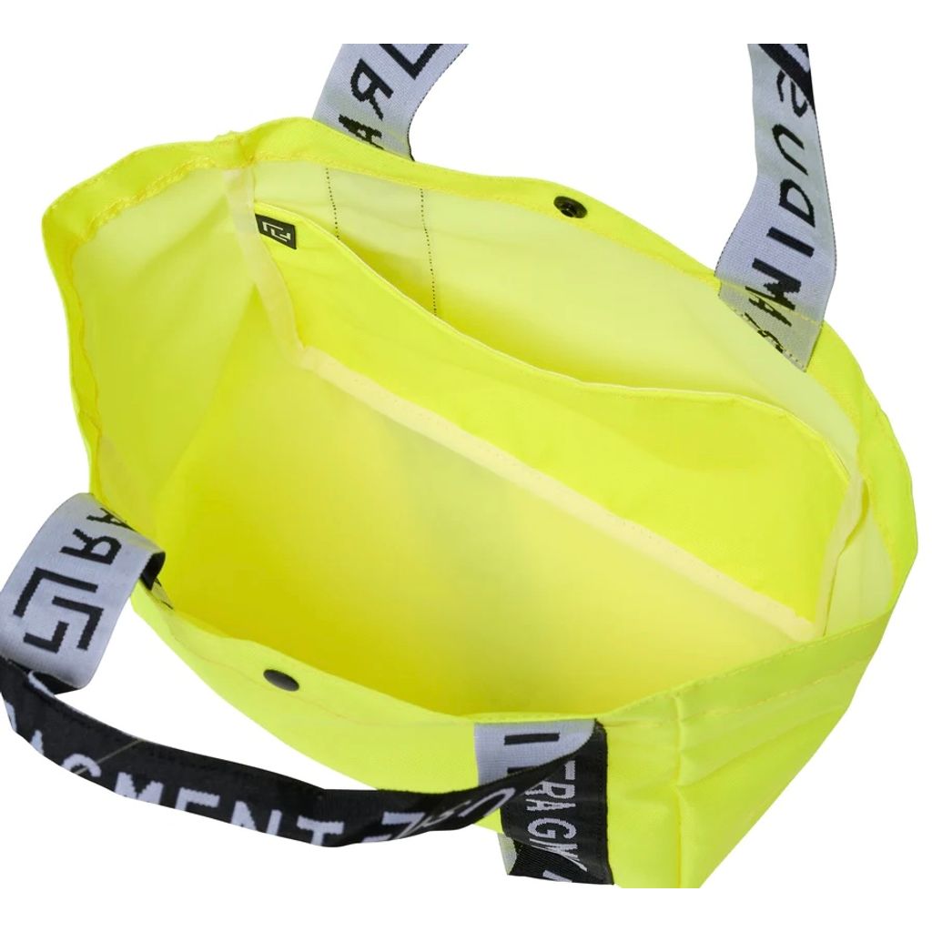 ペットボトル、ロングウォレットが横向きに入るタウンユースに十分なサイズ感のボックス型トートバッグ。1本のテープで切れ目無く構成されたハンドルは、両ブランドのロゴが織り込まれたfragment designとのコラボレーションを象徴する特別仕様。