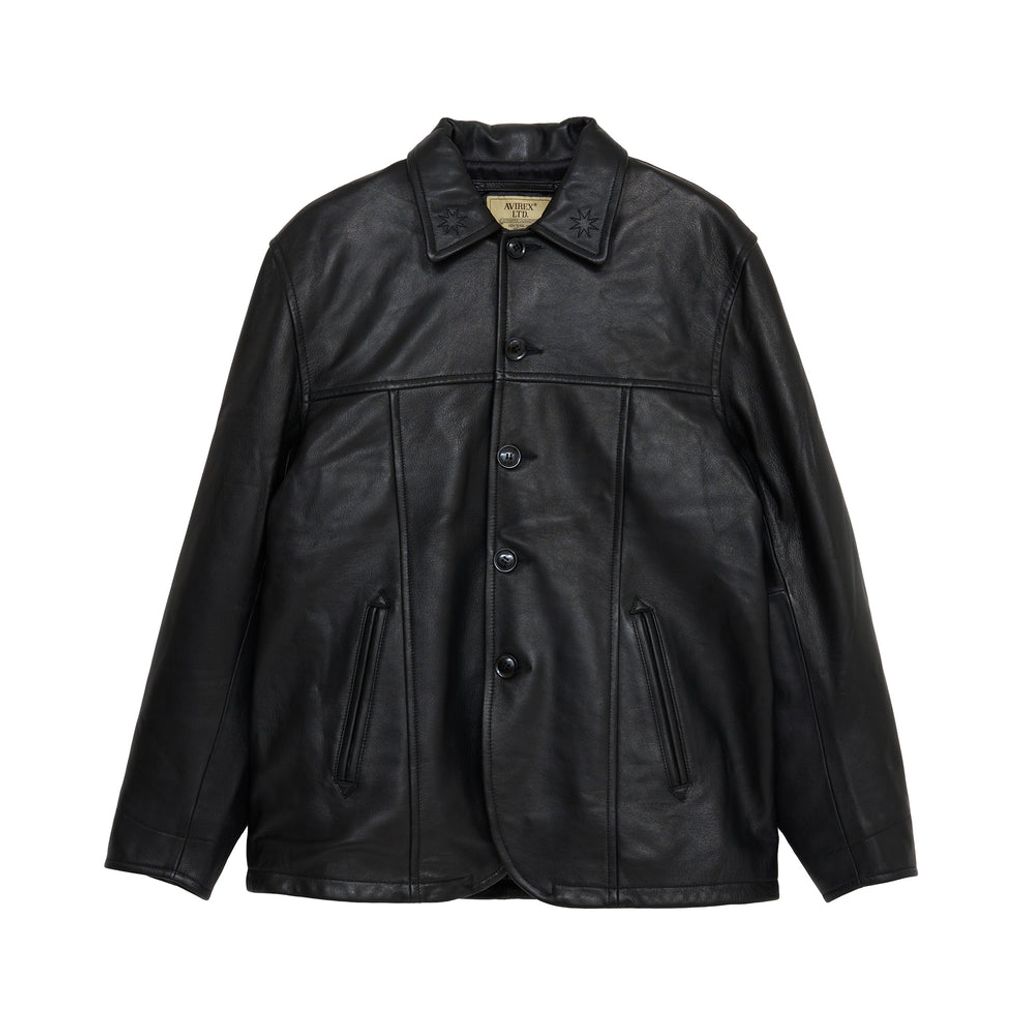 熊谷のリクエストにより、通常AVIREXでは展開していないGDCモデルとして仕立てた、柔らかなゴートスキンを採用したレザーカーコート。ジャケットとコートの中間のようなバランスで構築され、クラシックでありながらモダンな空気感をまとっています。こちらも同様に、着るほどに身体に馴染む経年変化を楽しめる仕様に仕上げています。襟元には同じく8芒星のSTAモチーフを同色で刺繍し、控えめながら印象に残るアクセントとしています。両者のバックグラウンドとクラフトマンシップが交差することで生まれた本コレクションは、クラシックなレザーウェアに現代的な解釈を加えた、今の時代にフィットするプロダクトとなっています。