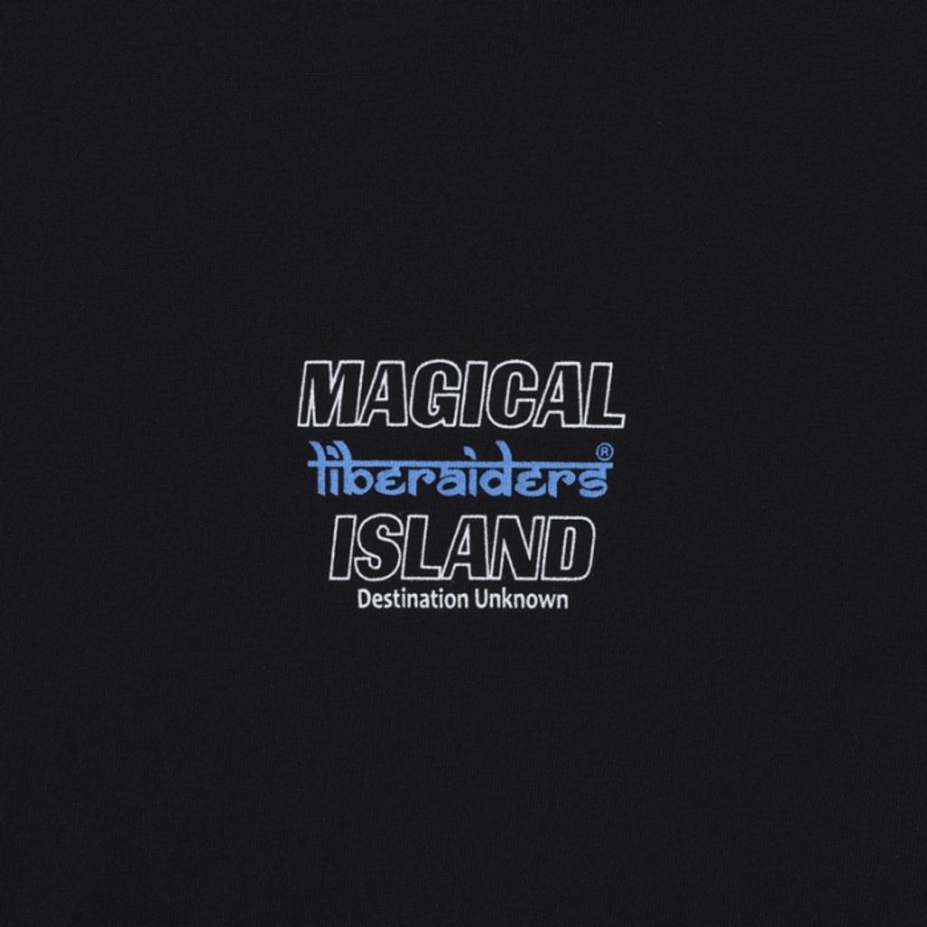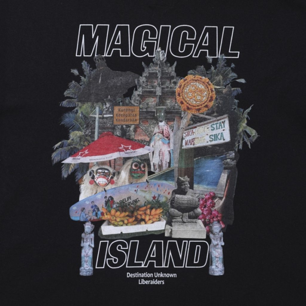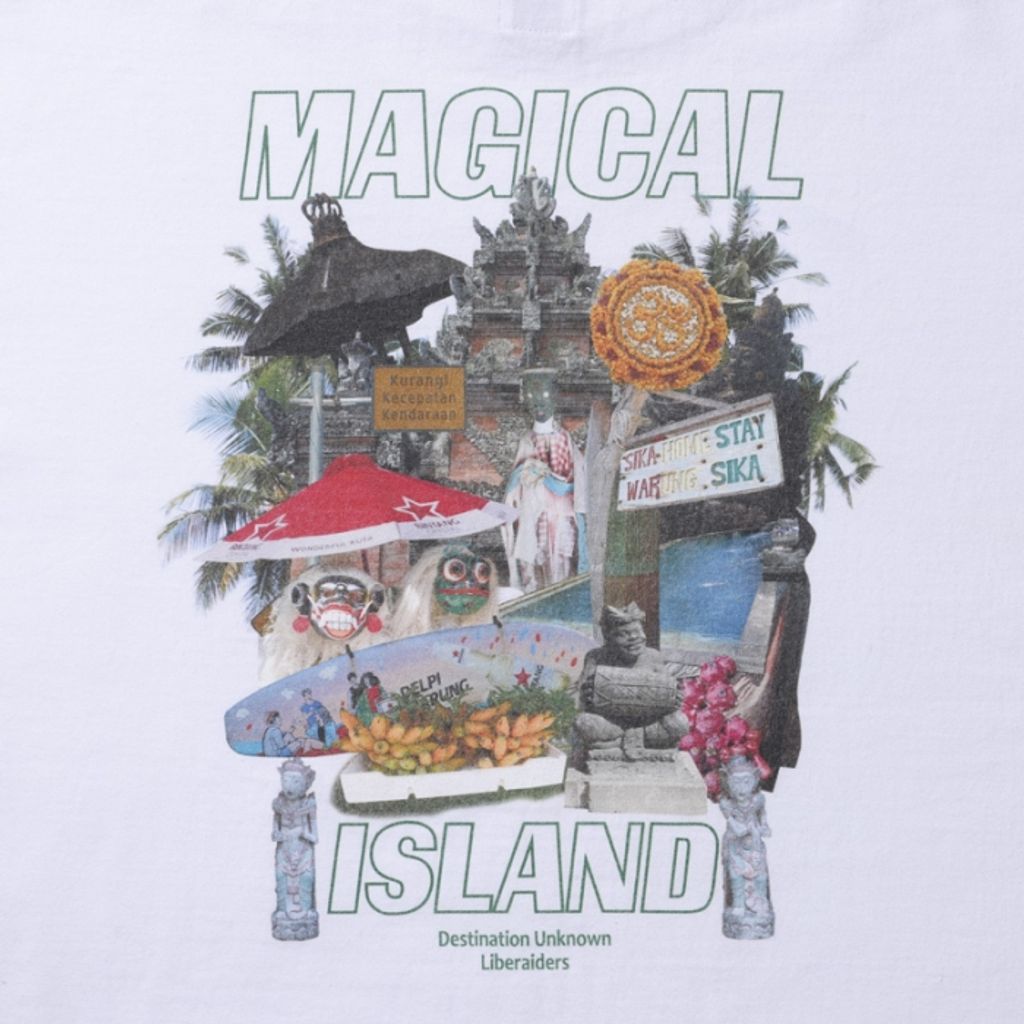 【MAGICAL ISLAND】=不思議な島の文字と共にバリの風景をコラージュしたグラフィックがプリントされています。