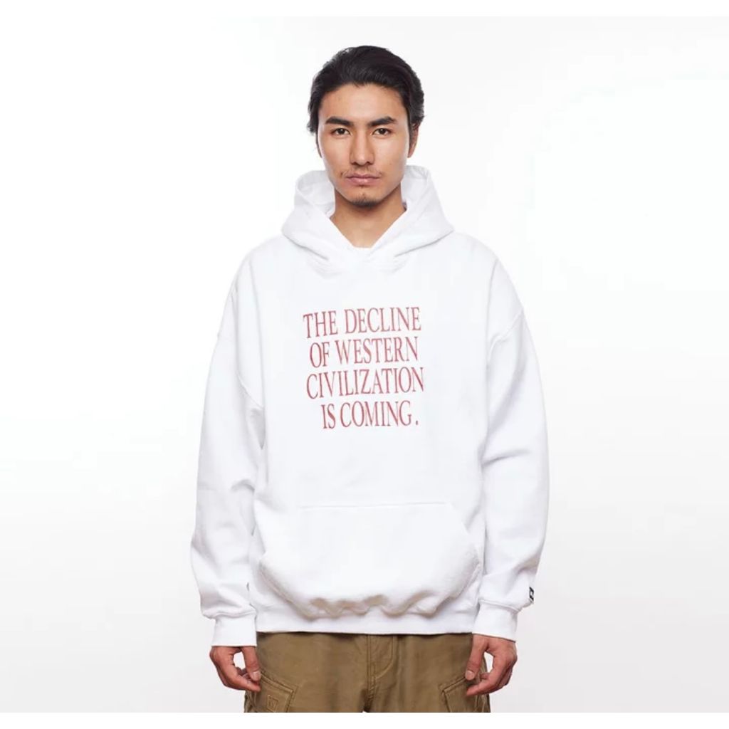 『THE DECLINE OF WESTERN CIVILIZATION IS COMING』のメッセージをクラック(ひび割れ)プリントで入れたフーディ。