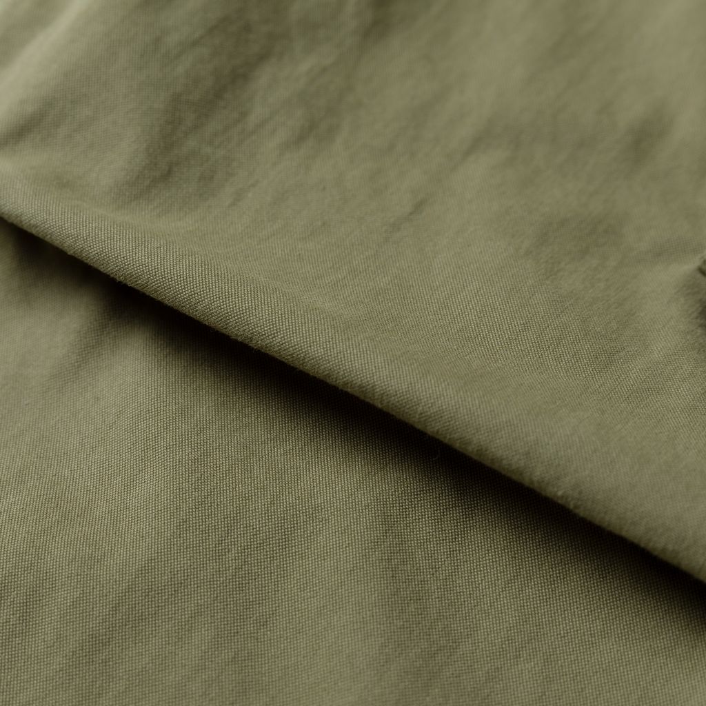 ウォッシュをかけたアーミーグリーン配色のライトウェイトコットン素材を使用したカーゴパンツ。膝位置にタックが2本入り、ウエスト左右にはアジャスターベルトを配置。膝下からテーパードするシルエットに仕上げてあるので、着用時に独特のバランスでの着用が可能。両脇・背面にフラップポケット、膝側面にカーゴポケットを配置。ウエスト・腿にゆとりのある緩やかにテーパードするシルエット。