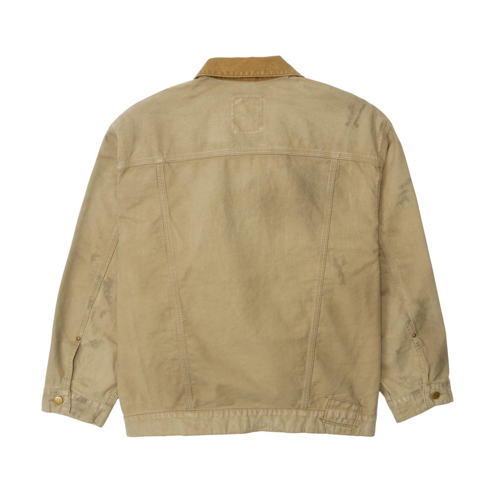 ヘビーウェイトなコットンダック素材を使用したトラッカージャケット。身頃と襟を配色切り替え、ネオバーボタンをゴールド配色にすることで、全体をアーシーなカラートーンに纏めたデザイン。胸・肩・袖口・胸元などの各所を3本針でタフに仕上げた仕様。身頃にはアタリや汚れなどリアルに使い込んだ風合いを加工で表現。両胸にフラップポケット、両脇にスリットポケットを配置。ドロップショルダー、身幅にゆとりのあるシルエット。