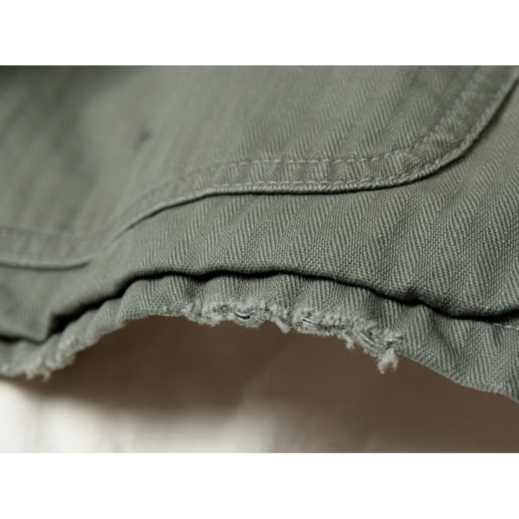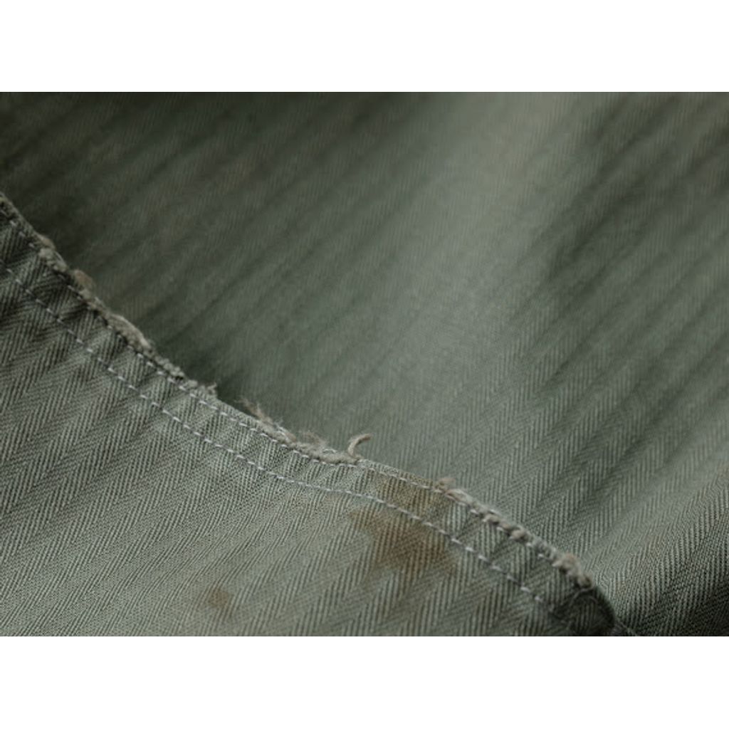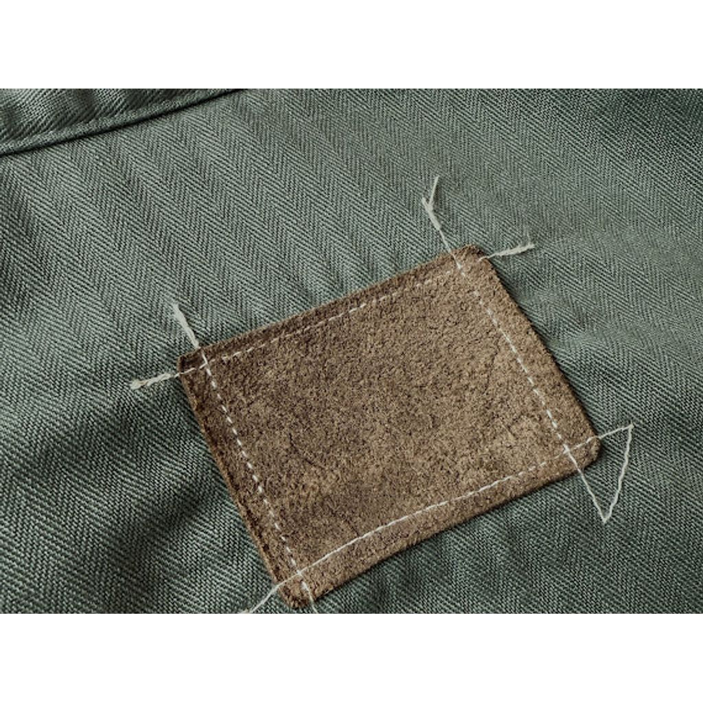 背面機下にレザーパッチをワンストロークステッチで叩きつけ。襟、身頃、ポケット緑などの各所にダメージ加工を施しヘリテージライクな表情を演出。前立て、袖口はドーナツボタンを採用。身幅にゆとりのあるシルエット。メイド・イン・ジャパン。