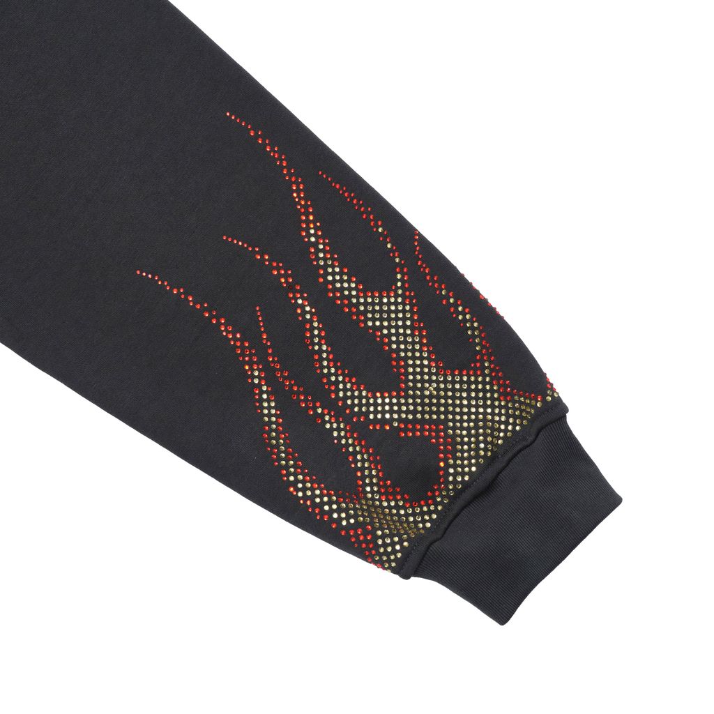 オリジナルで製作したぬめり感のある上質な裏毛を使用。背面のダーツや変形ポジションプリントなどブランドのらしさが詰まった製品にY2Kを思い出させるラインストーンをふんだんに使用してオリジナルで描き上げたファイヤーパターンを両袖に落とし込んだハードな印象の一枚。