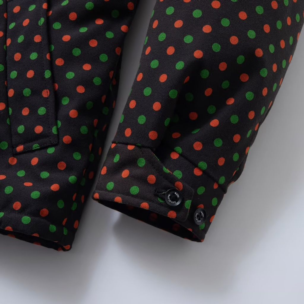 オリジナルのドット柄をプリントしたポリエステル素材を使用した中綿入りスイングトップ。身頃の両腰にスラッシュポケット、立ち襟には2連でボタン留めを付属したデザイン。