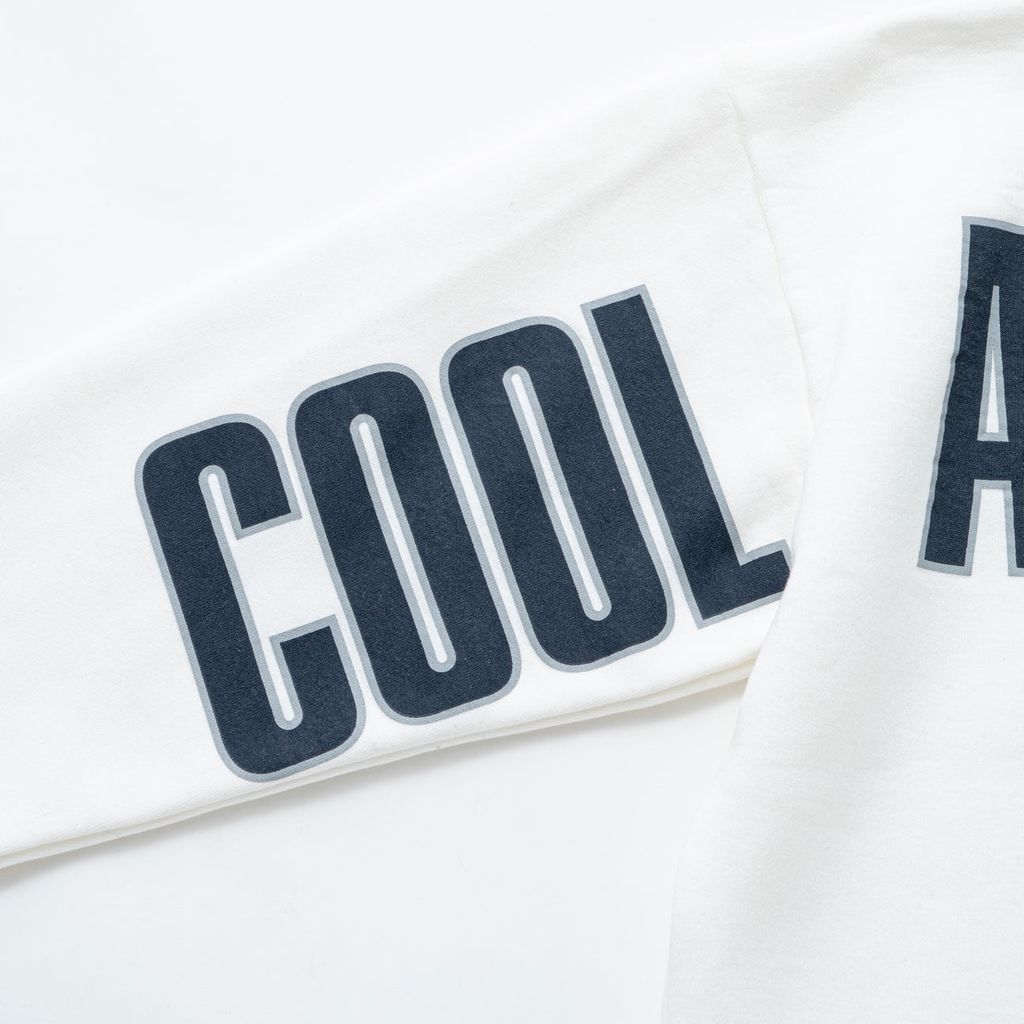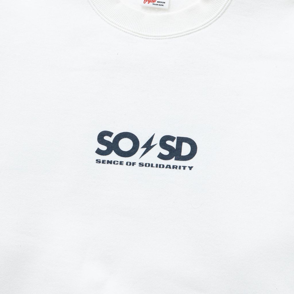 13oz.のコットン裏毛起毛素材を使用したクルーネックスウェットシャツ。フロントにSO/SD・SENCE OF SOLIDARITYネーム、バックにCOOL AND THE CRAZYのレターグラフィックをスリーブ〜ヨークを横断する様にラバープリントで表現したインパクトあるデザイン。製品にてワンウォッシュ済み。レギュラーフィットシルエット。