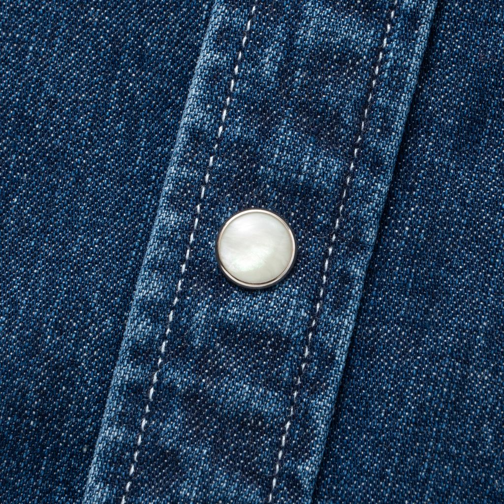 ユーズド加工を施した9oz.のオリジナルデニム生地を使用したウエスタンシャツ。胸元左右にフラップポケットを配置、左ポケット上部にピスネームを叩きつけ。前立て・袖口にはシェルボタンを採用、背面にはオリジナルデザインのヨークを配置。色落ちを極力抑え、シーム箇所にパッカリングを演出した高度なワンウォッシュ仕上げ。袖は剣ボロ仕立て、裾は緩やかなラウンドカット、レギュラーフィットシルエット。