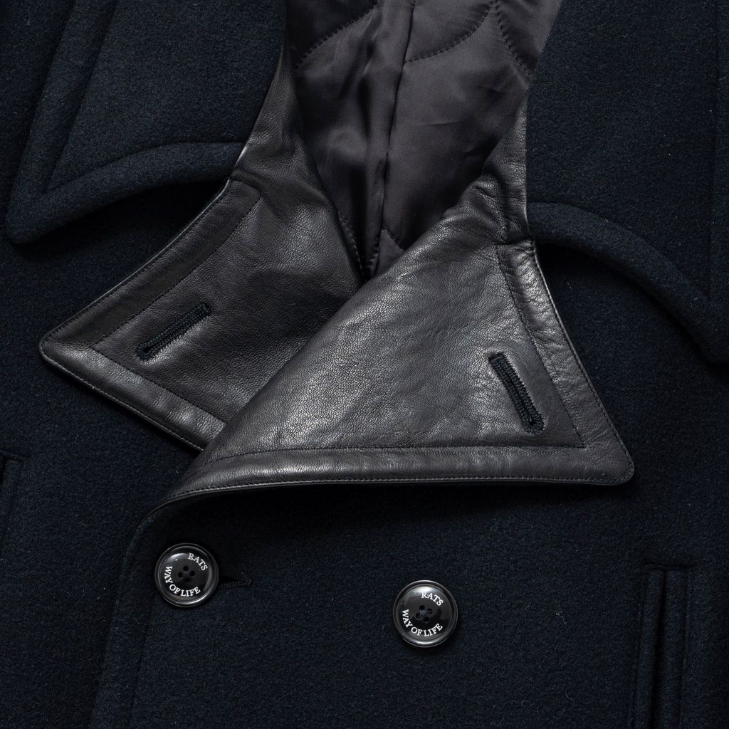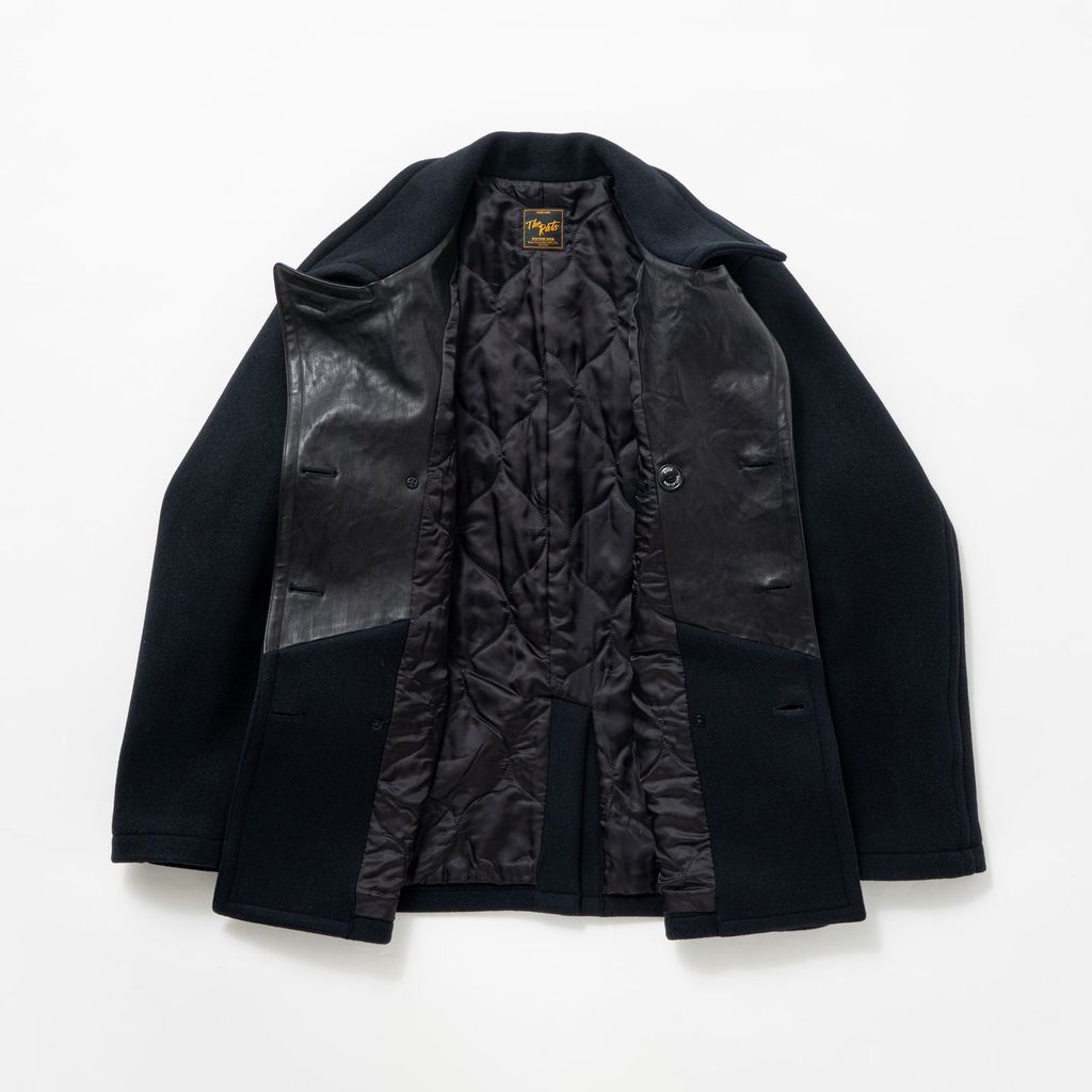 表地は軽量かつ光沢が豊か、保温性・しなやかさに富む上質なメルトン、裏地に中綿入り瓢箪キルトを使用したオリジナルのPコート。ラペルの下側をホースハイドレザーで切り替えた印象的なデザイン。両胸にハンドウォーマーポケット、両腰にフラップ付きポケット、身頃内側にスラッシュポケットを配置。前立てにはオリジナル刻印ボタンを採用。レギュラーフィットシルエット。1色5サイズ展開。