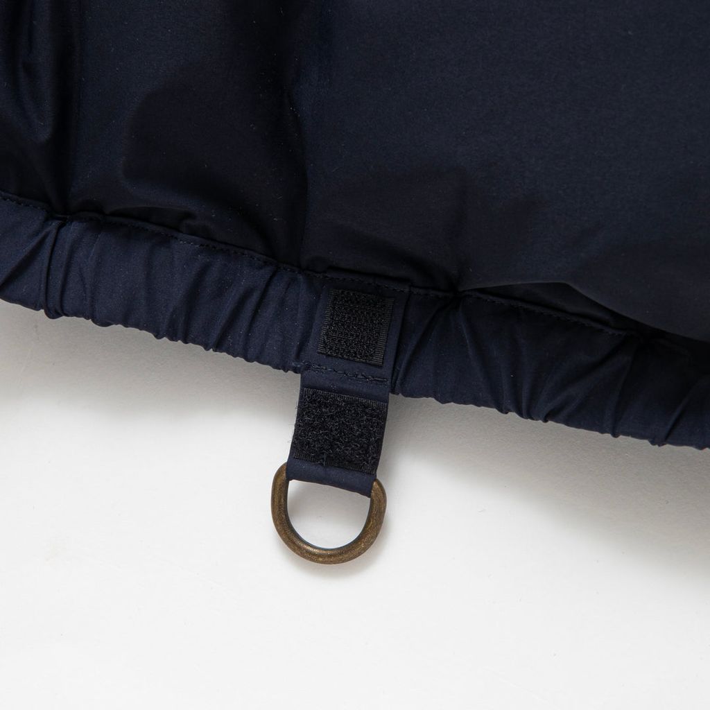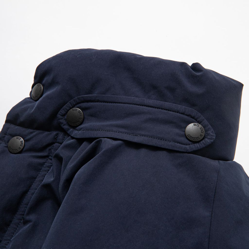 撥水性・ストレッチ性に優れる高密度に織上げたポリエステル/ナイロン混紡のツイル素材を使用したダウンジャケット。中綿には750フィルパワーのKAWADA DOWNを使用した高い保温性を有するスペック。左胸にBLACK AND YELLOWの織ネームを叩きつけ、両脇にスラッシュポケットを配置、襟にスナップボタンが付属するチンストラップを格納したデザイン。前立ては比翼仕立て、スナップボタンはRATS・SENCE OF SOLIDARITYの刻印を施したオリジナル、裾左端にD環を付属したテープを叩きつけ。アームホール・身幅にゆとりのあるシルエット。2色5サイズ展開。