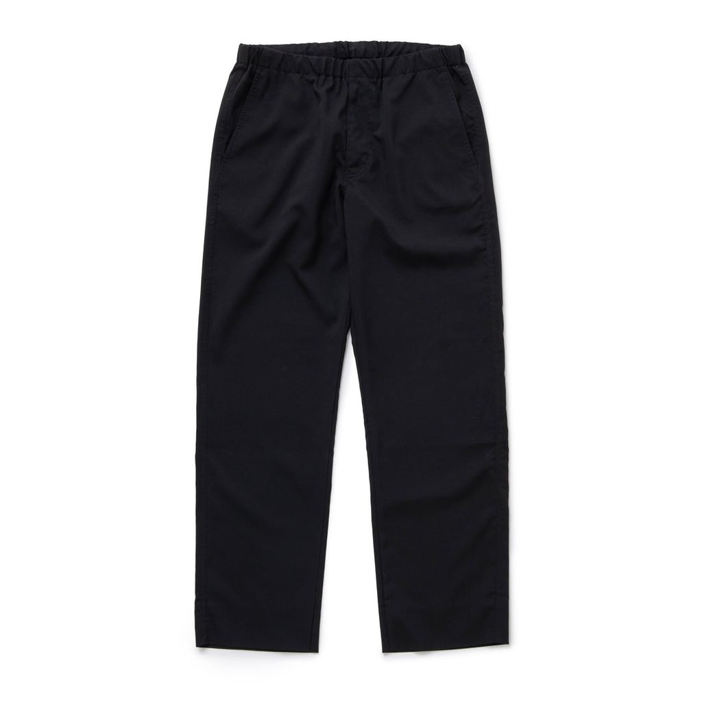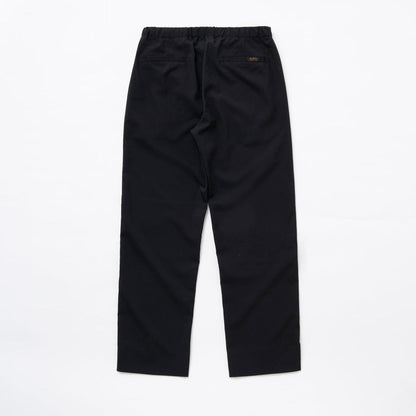 吸水速乾・接触冷感・防皺加工を施したポリエステル素材のイージーラインパンツ。両脇にスラッシュポケット、背面左右に両玉縁ポケット、背面右ポケット縁にピスネームを叩きつけ、側章部分に太さのあるラインテープを配置したデザイン。スラックスの様な綺麗さを有したイージーパンツ仕立て。ウエスト内側にスピンドルが付属、シルエット調整が可能な仕様。ウエスト・腿にゆとりがありながらレッグが綺麗に見えるストレートシルエット。3色5サイズ展開。