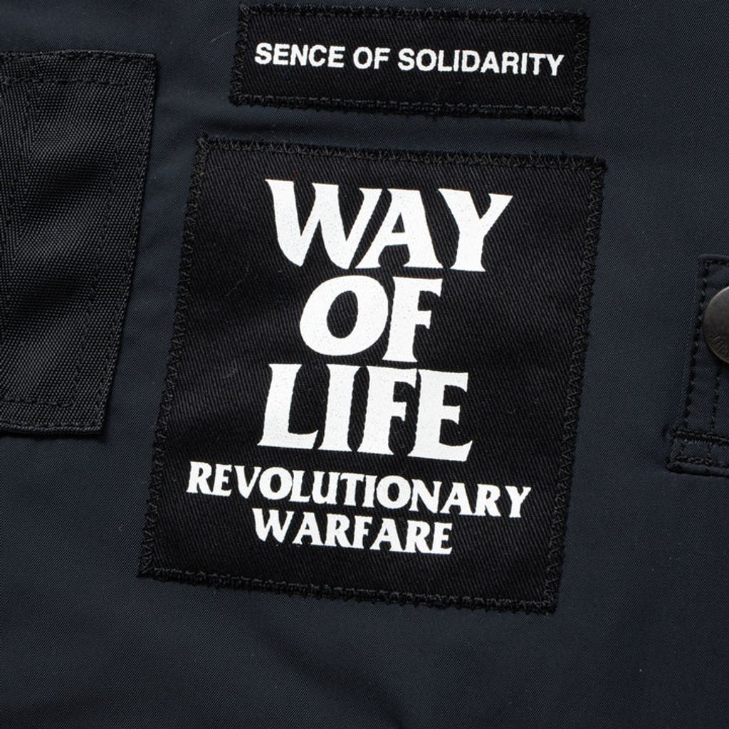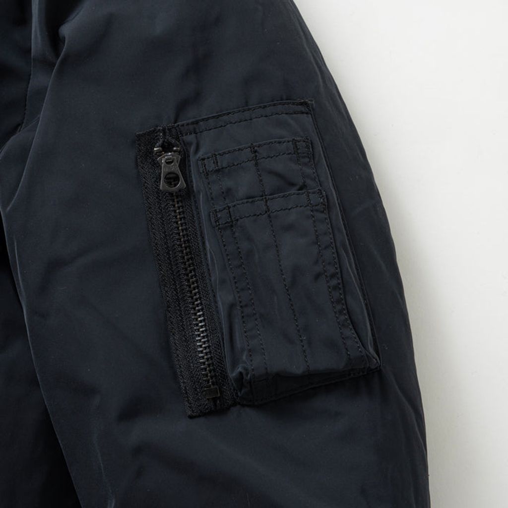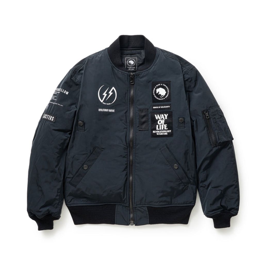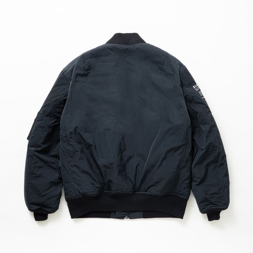 マットな質感、撥水性に富むオリジナルで作成したポリエステル生地を使用したMA-1ジャケット。着丈をやや長めに設計するなどシルエットは現代的ながら、中綿を詰め裏地に厚みを出したことで程よいボリュームと高い保温性を味わえる仕上がりに。身頃の内側にスラッシュポケット、ポケットライニングにはコーデュロイをセレクト。左胸にワッペン、右胸に3D刺繍、右肩にプリント・ナイロンテープをあしらった、高インパクトのデザイン。レギュラーフィットシルエット。1色5サイズ展開。