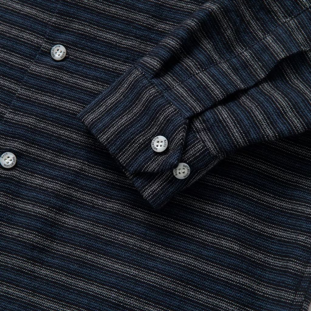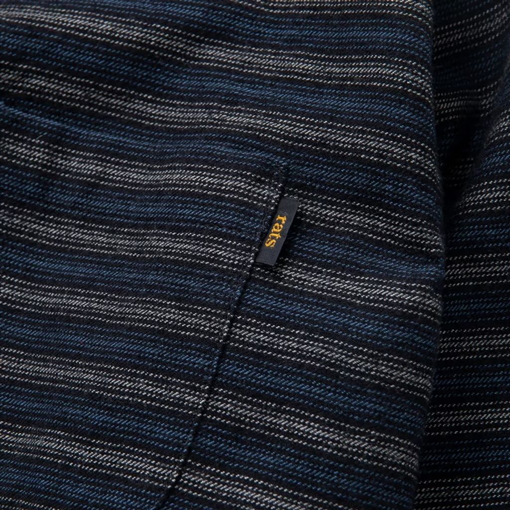 コットン/ウールの混紡素材を使用したオリジナルファブリックのオープンカラーシャツ。ジャガード織りでネイティブ柄の様なストライプ柄を表現したデザイン。左胸にパッチポケット、ポケット縁にピスネームを付属。ワンウォッシュ、身幅にややゆとりのあるボックスシルエット。