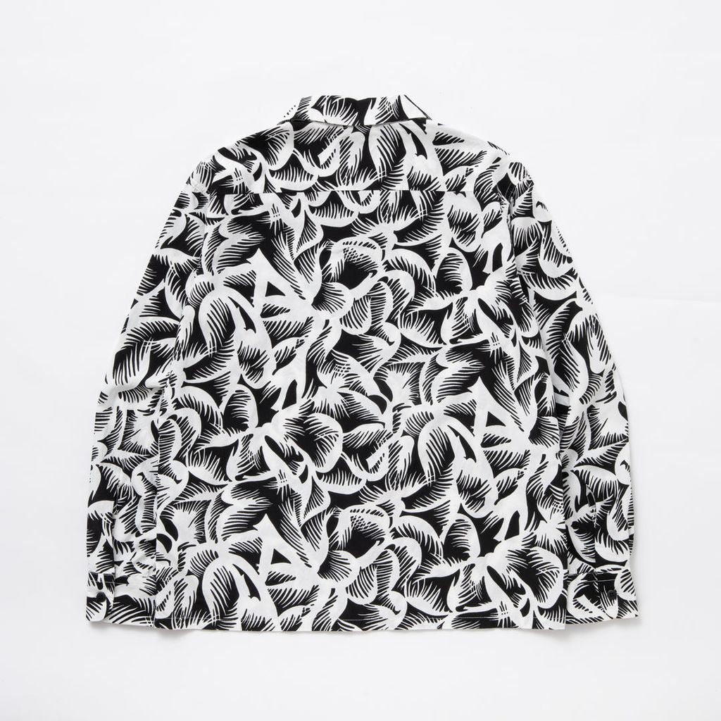 レーヨン/コットンの混紡素材を使用したオープンカラー仕様の長袖ハワイアンシャツ。パームツリーの総柄プリントで表現したオリジナルテキスタイルを採用。左胸にボタン付きフラップポケットを配置、ポケット縁にはratsロゴが刺繍されたピスネームを挟み込んだデザイン。袖口はシングルカフ仕様、裾はクラシックなボックス型とクラシックな意匠を採用したデザイン。身幅にややゆとりのあるボクシーなシルエット。ワンウォッシュ仕上げ。