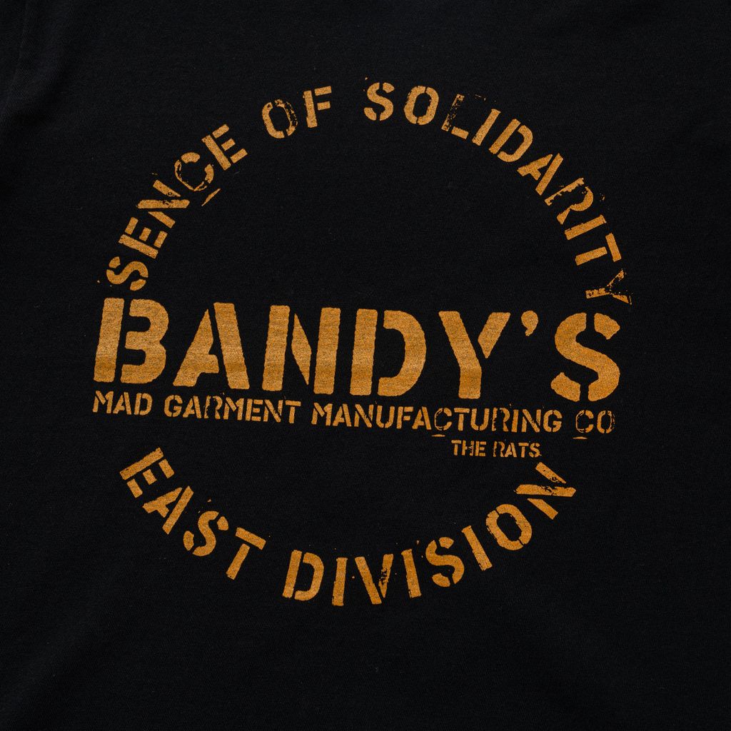 7.5oz.のコットン/キュプラの混紡天竺素材を使用したショートスリーブTシャツ。フロントに“BANDY’S”・“sence of solidarity ”・“EAST DIVISION”を組み合わせたサークル型レターグラフィックをラバープリントで表現したデザイン。背面右腰にRatモチーフのワンポイント刺繍。レギュラーフィットシルエット。製品にてワンウォッシュ済み。3色5サイズ展開。
