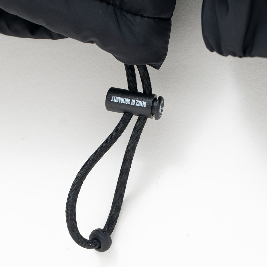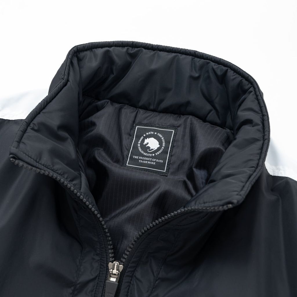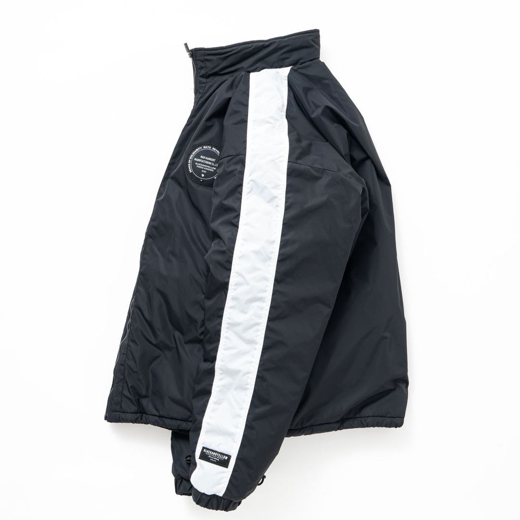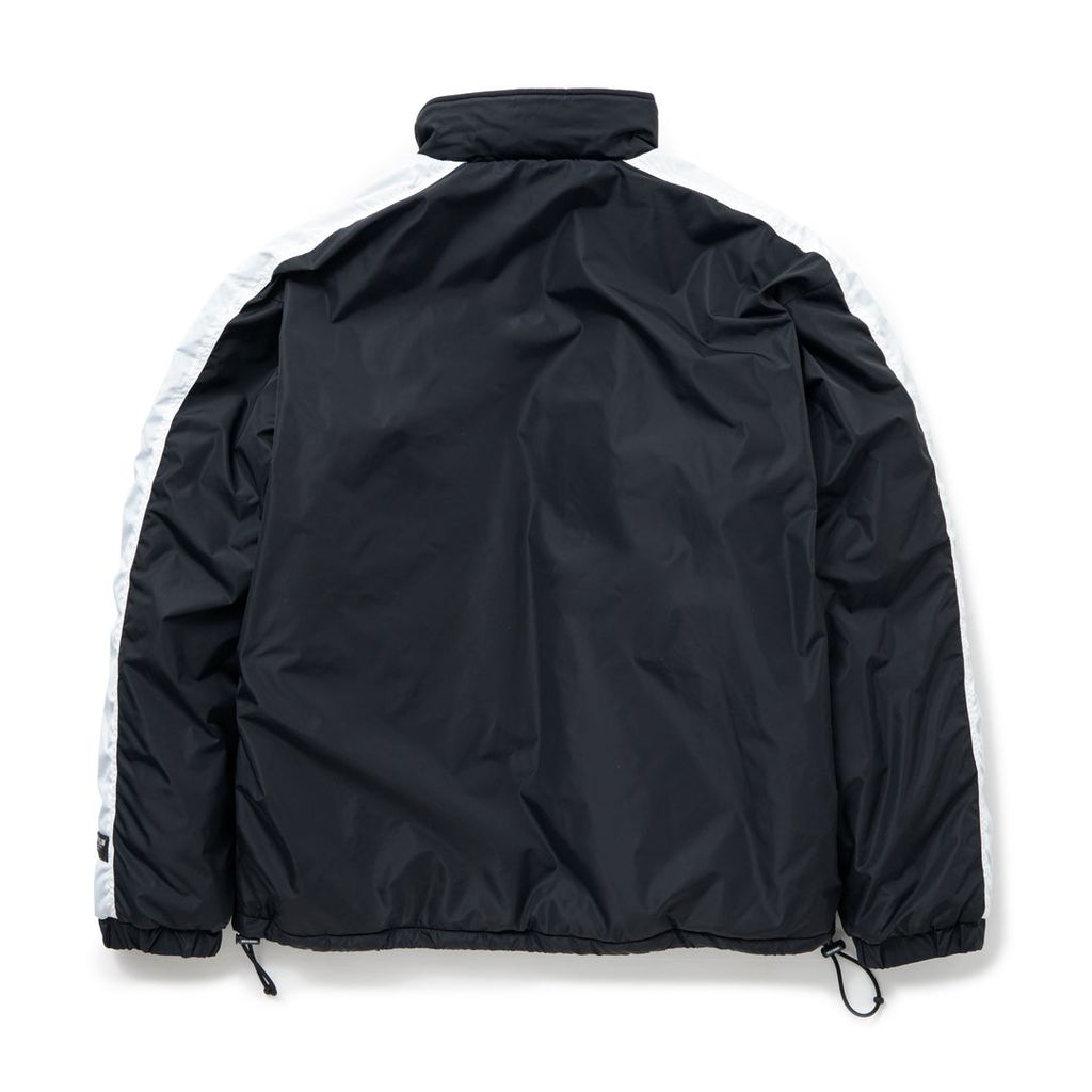 表地に撥水性のあるナイロン生地、裏地にはプリマロフト中綿入りのリップストップナイロン生地を使用したスタンドカラーのトラックジャケット。左胸にレターグラフィックを刺繍したサークル型フェルトワッペン、左袖にBLACK AND YELLOWを刺繍したフェルトワッペンを叩きつけ。両腕に身頃と配色を切り替えたラインテープを配置した仕様。裾両端にスピンドルが付属、シルエット調整が可能。身幅にゆとりのあるシルエット。1色5サイズ展開。