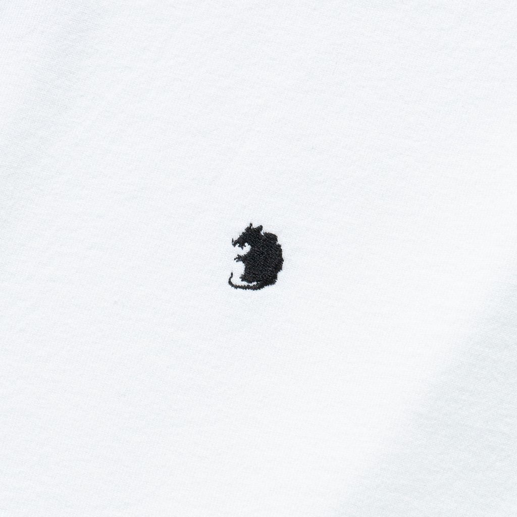 6.4オンスのコットン天竺素材を使用したショートスリーブTシャツ。襟・袖を配色切り替えでバインダー付けしたトリムT仕様。前見頃にサークルグラフィックをエンブレム風に仕上げたモチーフをラバープリント、エンブレム外枠に微発泡プリントでステッチを表現したデザイン。背面右腰にRatモチーフのワンポイント刺繍。レギュラーフィットシルエット。製品にてワンウォッシュ済み。2色5サイズ展開。