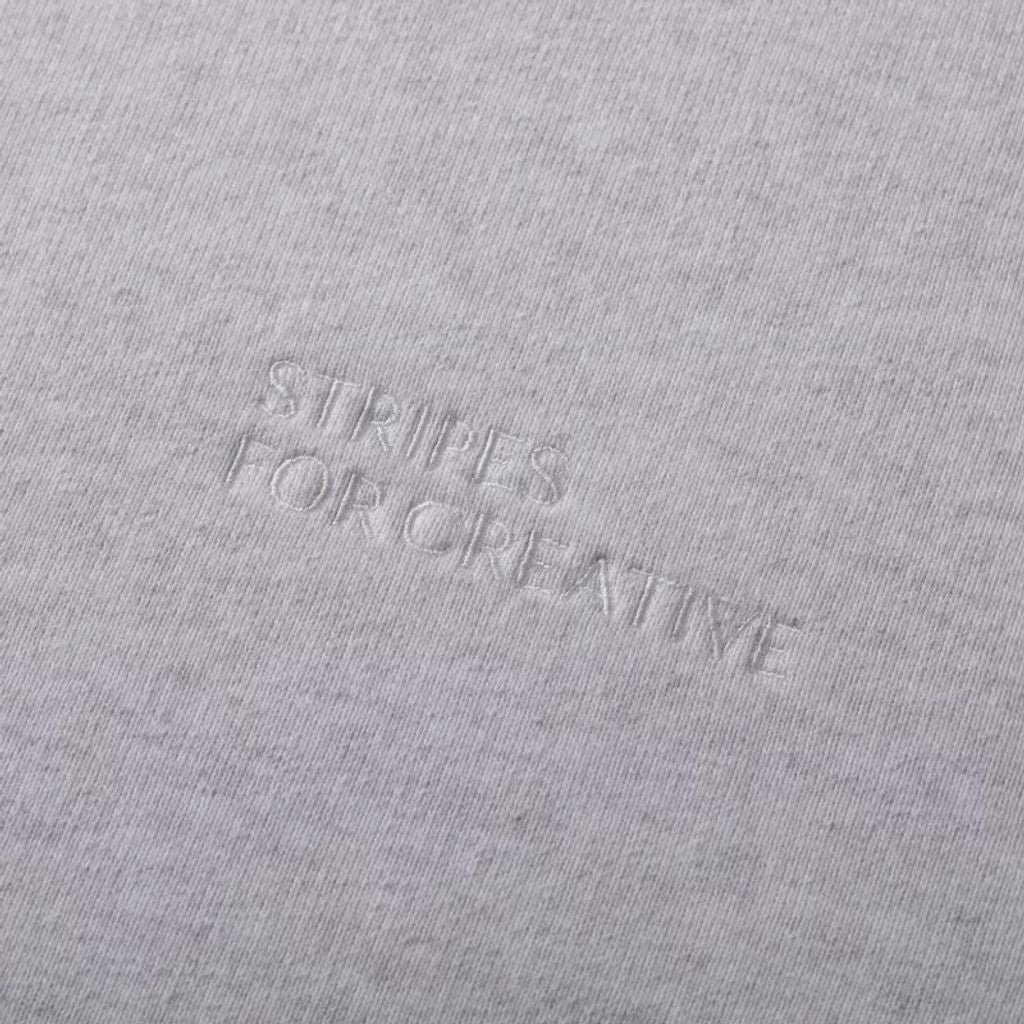 SFC定番のオーバーサイズクルースウェット。首元にオリジナルストライプ柄の刺繍を施したVガゼットを取り付けUPDATEしています。