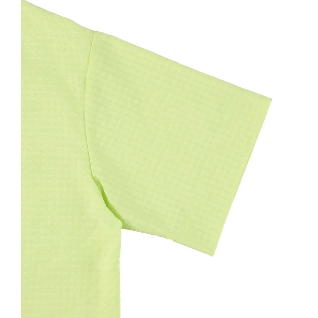 透け感のあるチェック柄の生地を使用したオープンカラーシャツ