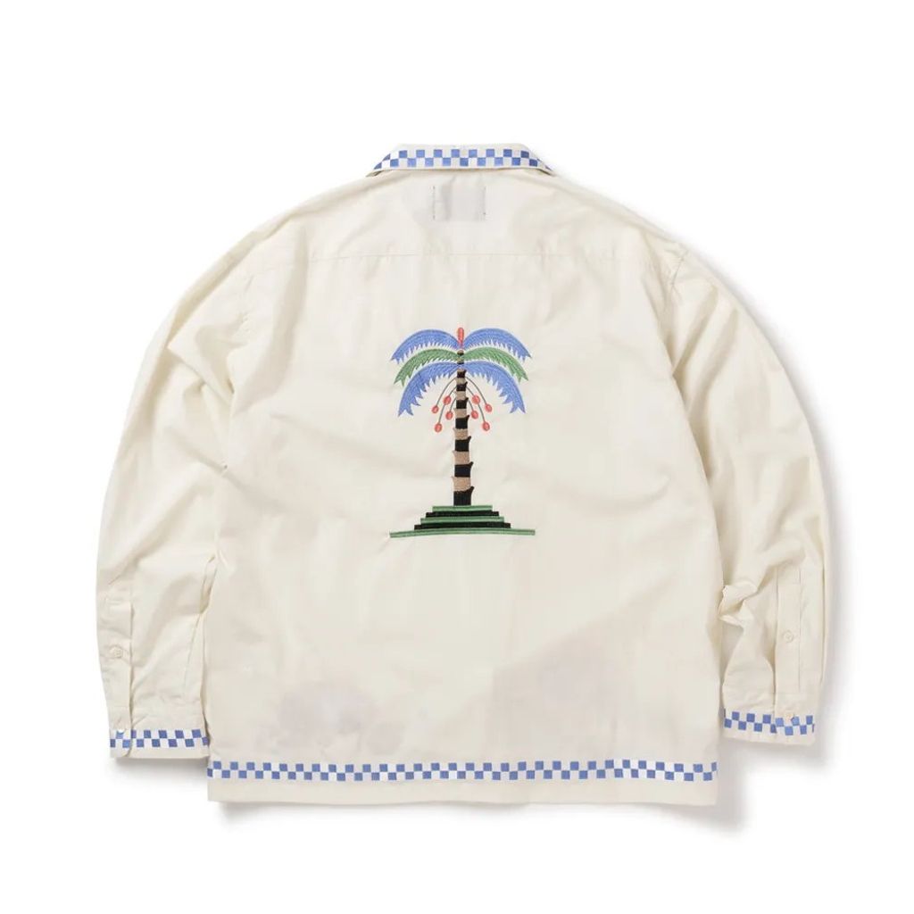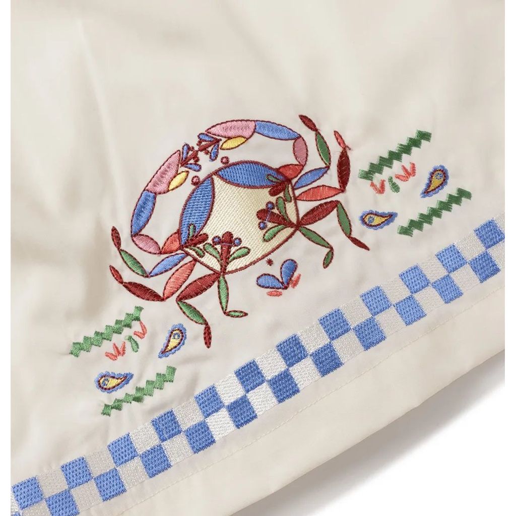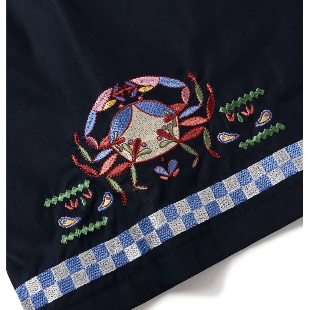 カニのモチーフを刺繍したオープンカラーシャツ。