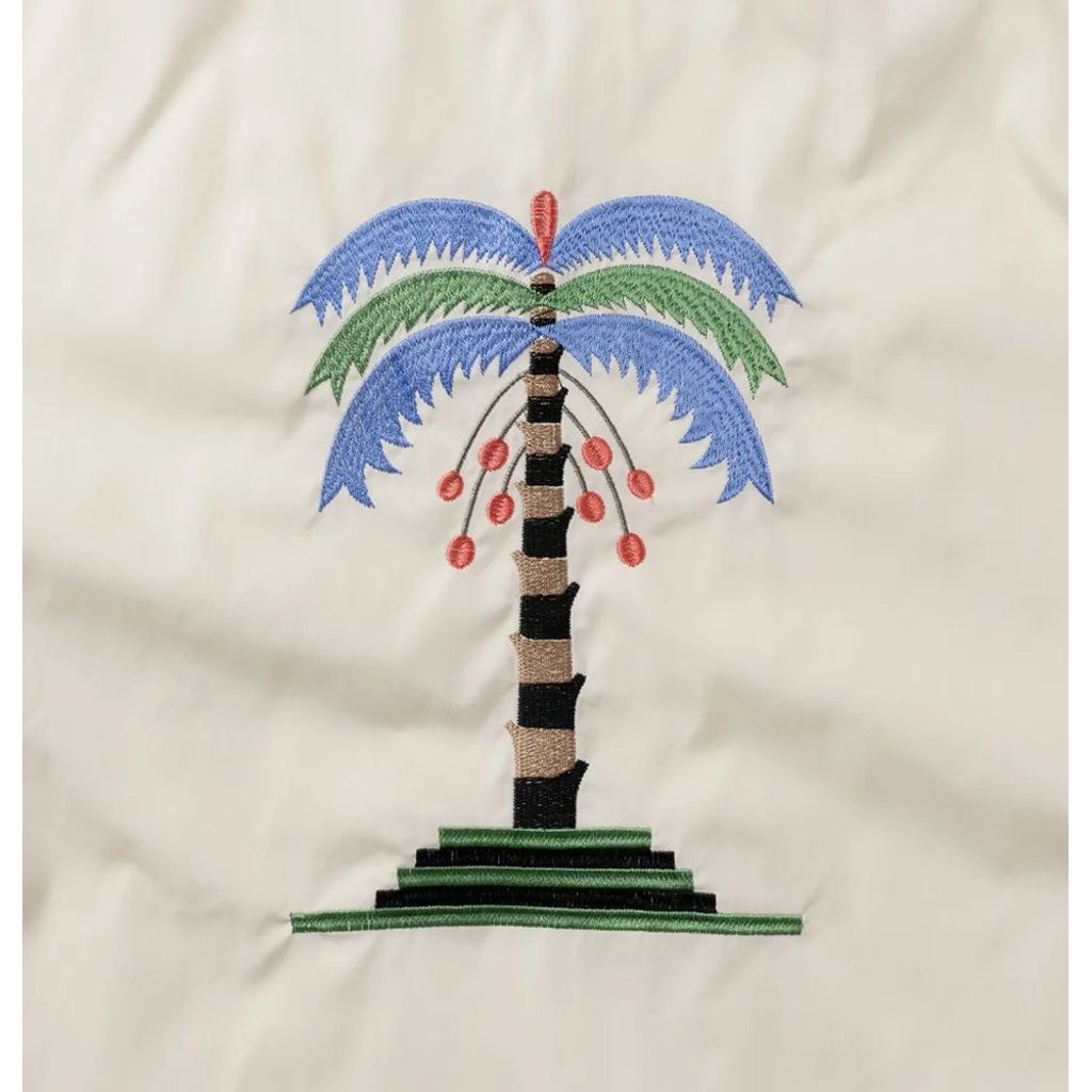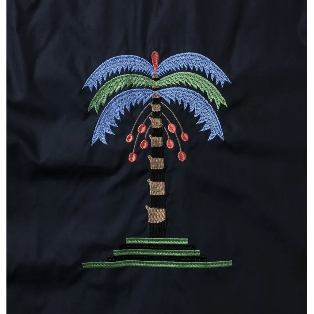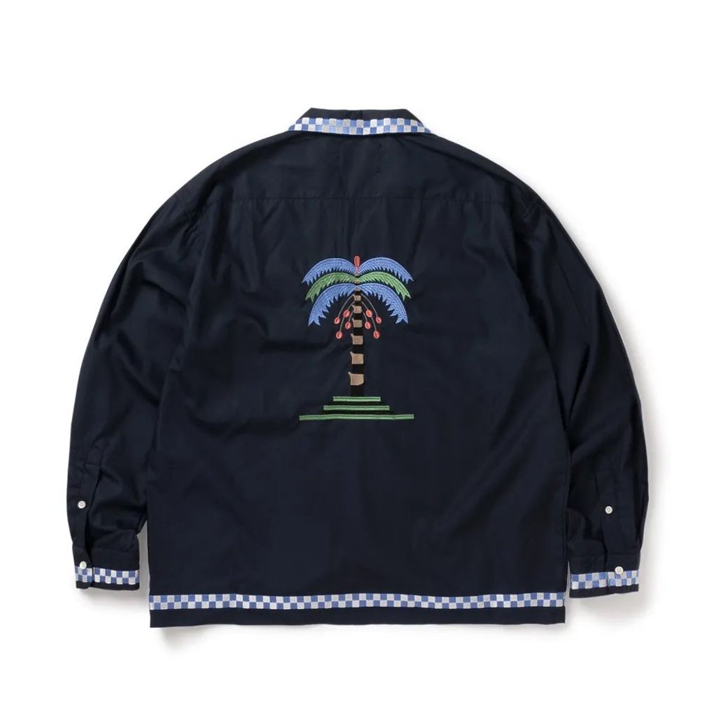 カニのモチーフを刺繍したオープンカラーシャツ。