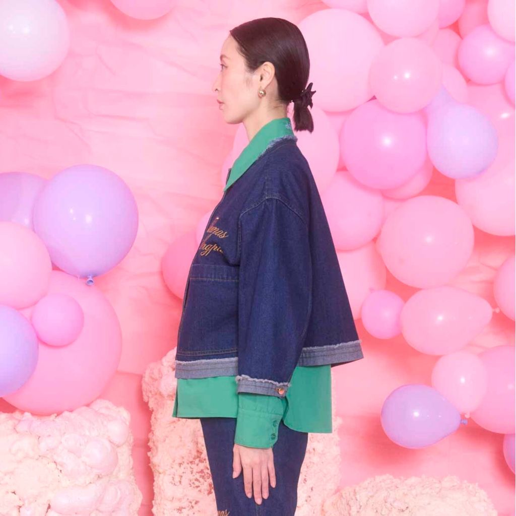 以前から出しているデニムジャケットは、少しの変更を加えてリデザインしています。今回は以前から人気のショートジャケットの形から、春夏にサクッと羽織れる涼しげな羽織りアイテムです。オールシーズン羽織る事ができて、夏のカーディガンのように冷房よけに使えるかもしれません。厚みがあまりなく軽いので持ち歩きの負担も少ないかもしれません。スカート派には便利な長さになっています。またこれまで着丈の長いオーバーサイズばかりだった方にも新鮮なショート丈アイテムかもしれません。ショートといっても短すぎず、ほどよい長さがあります。また身頃やアームはとても大きめで体型は選びません。袖丈は短めで夏に向いています。秋冬は、袖から長袖を出して着用してもバランスがとりやすいと思います。胸にブランドロゴ刺繍が入ります。刺繍はやや大きめで贅沢感が感じられると思います。ジャケットとコートは大きめのブランドロゴを入れることにしました。とても丁寧な刺繍になっていて、フォントもデニムに相反するクラシックなフォントがイメージだったので筆記体を使っています。