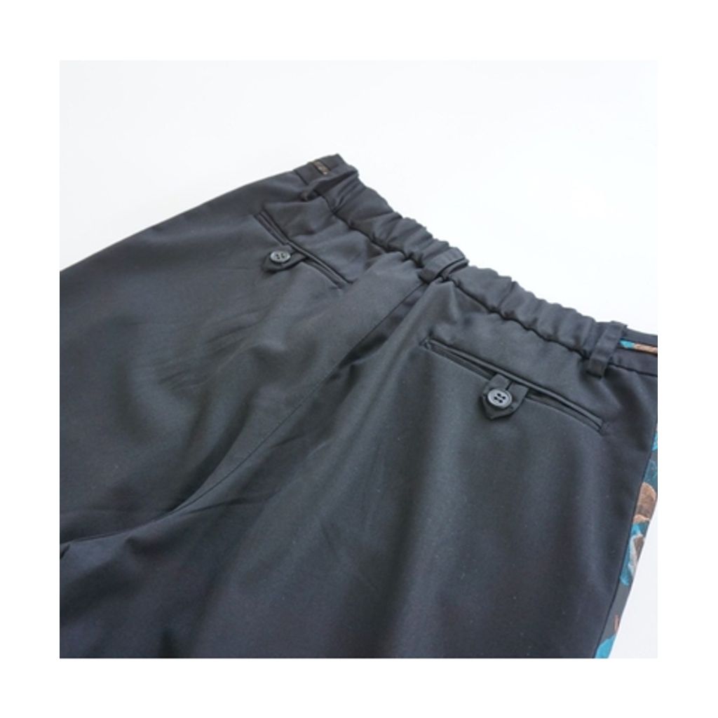 このパンツは股上が深くなくすっきりとしています。浅めのタックがいい仕事をしていて、お腹の出っ張りが気にならないようにしています。これまで8年出してきたパンツの中で一番人気のパンツをワイドに変更しました。以前もウールライクな生地で出していて人気でした。ヒップから太もも周辺にかけてはすっきりとしていてだぶつきがありません。柔らかくサラッとしている生地ですが、股下から一直線に広がるワイドシルエットが脚長効果を発揮します。ブラックのパンツは何本あっても嬉しいアイテム。今回はサイドラインを花柄ジャガードにしています。パンツは展示会でも目立たないアイテムですが、今回はサイドのラインが花柄で試着率が高く人気でした。ベルト部分にも同じ花柄でラインを入れています。後ろはゴム。サンプルは間違っていますが、量産では後ろのゴム部分にも花柄のジャガードのラインが入るように仕上げます。