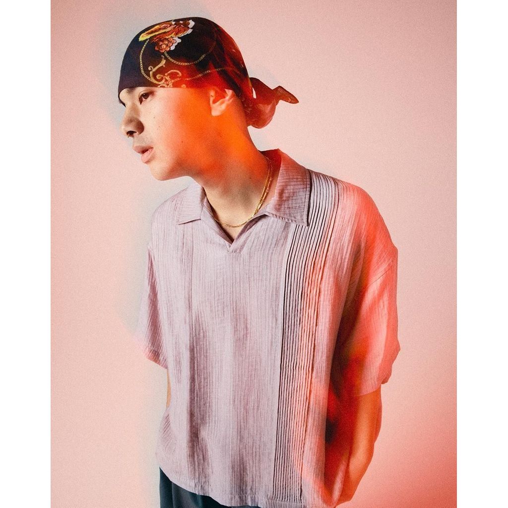 ドレープ感のある柔らかな素材でランダムな織り模様と光沢が特徴の生地を使用した開襟プルオーバーポロシャツ。