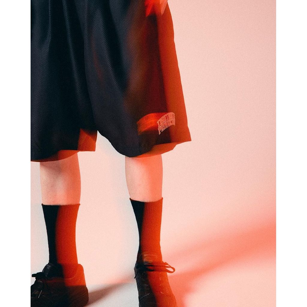 右身頃に色違いの生地を挿入した切り替えデザインのバスケットボール風ショートパンツ。