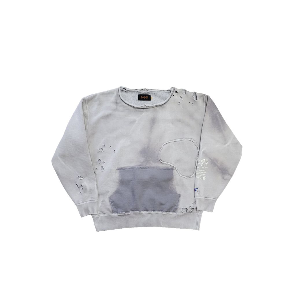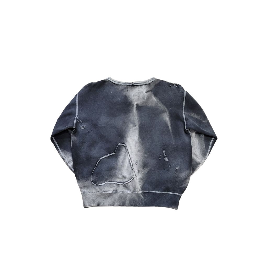 スーパーへヴィーウェイトな裏毛を使用したスエットパーカーのフード部分をカット。身頃前後に大きめな当布を縫い付けています。硫化染め後にオーロラ加工。